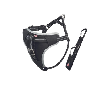 Tillverkad av slitstark nylon och bältesmaterial. Kan även användas som promenadsele. Reflekterande delar. Säkerhetsbälte tillåter fastsättning i brösthöjd. Passar alla bilmodeller.