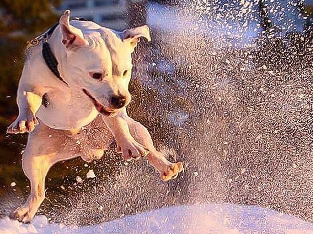 1:a pris, presentkort pÄ TRIXIE, vÀrde 500 kronor.Staffordshire bullterriern Elvis leker i snön.