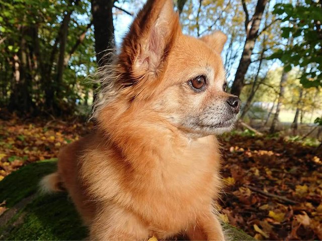 Smilla, en blandning mellan chihuahua och shih tzu, och Josefin Storm tar en paus i höstpromenaden.