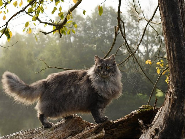 – Vi gick ut klockan fem på morgonen för att se solen gå upp i morgondimman. Här står Lysa på ett gammal nedfällt träd. Hon är en riktig modellkatt och vet precis hur hon ska ställa sig, det är bara att peka så gör hon sig redo!