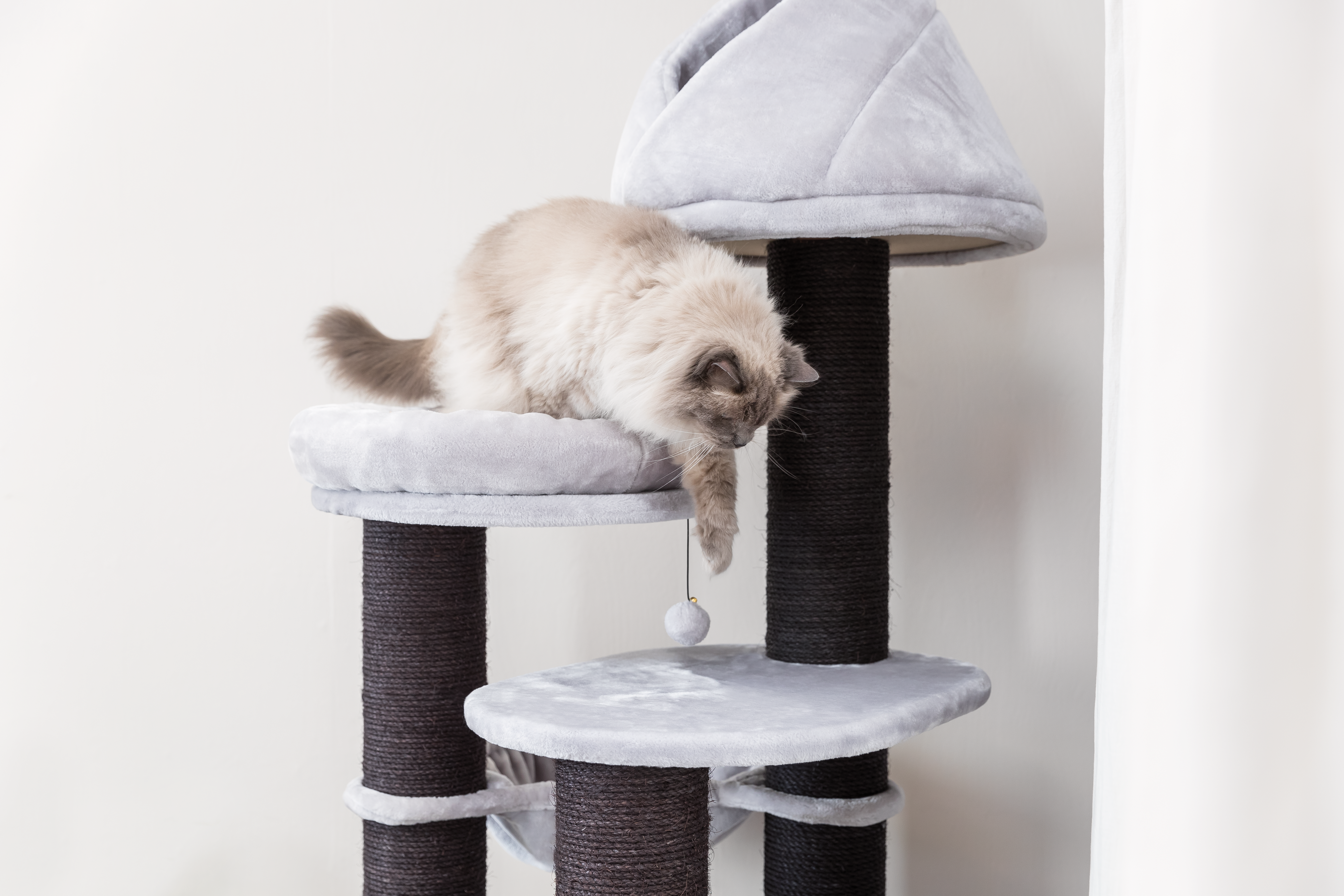 Katter tycker om att sträcka på ryggen och gör det gärna i samband med att de klöser, så se till att ha en klösställning som är tillräckligt hög. De flesta katter tycker också om att ha utsikt över sitt revir och väljer därför ofta en sovplats högt upp. Många klösmöbler har både grottor och mjuka bäddar på hög höjd som ger gott om valmöjligheter för din katt att hitta en mysig plats att vila på, med bra utsikt.