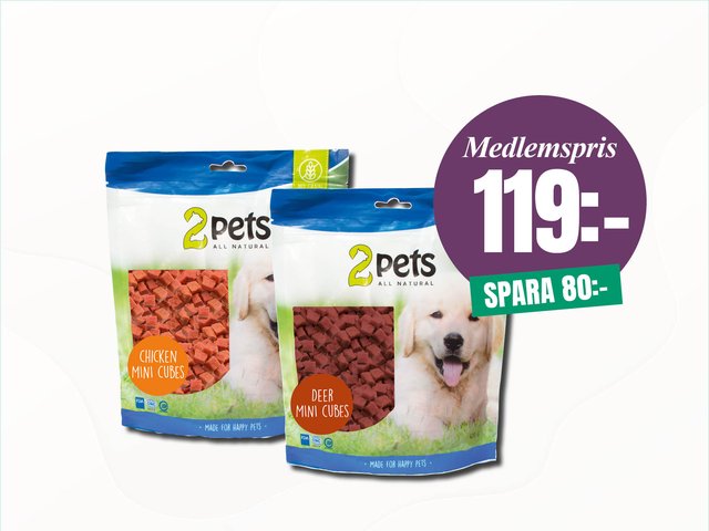 2Pets MiniCubes Ă€r mjuka, lyxiga hundgodisar med hela 88â90âŻ% kött â helt utan tillsatt socker, spannmĂ„l, tillsatser eller konserveringsmedel. De har hög smaklighet och lĂ„g fetthalt, vilket gör dem till ett nyttigt och uppskattat godis, perfekt som belöning du kan ge med gott samvete. De smular inte, kladdar inte och gĂ„r enkelt att dela â vĂ€lj mellan smakrik kyckling och hjortkött. Storlek: 400 g.