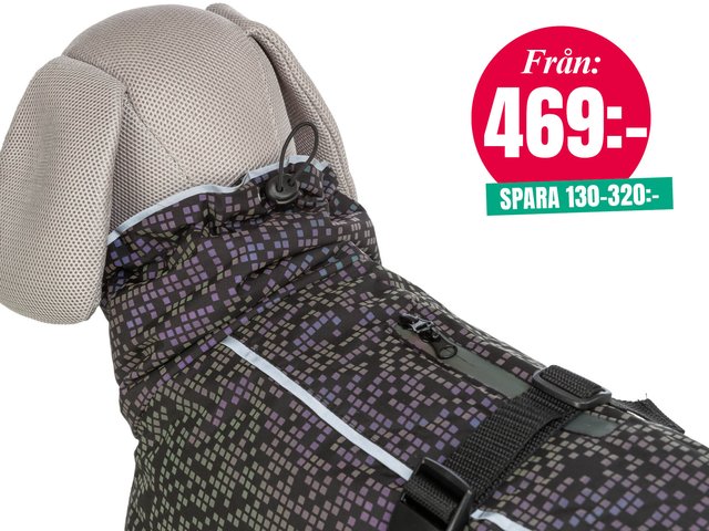 Det vindtĂ€ta materialet och den generösa passformen ger extra skydd över bakdelen samtidigt som tĂ€cket tillĂ„ter fri rörelse för skuldror och ben. Tack vare dragkedjan i ryggen kan den enkelt kombineras med en sele, dragsnören i bĂ„de hals och rygg skapar en passform som sitter riktigt bra. TĂ€cket hĂ„lls sĂ€kert pĂ„ plats med ett magband med spĂ€nne och justerbara benöglor â sĂ„ att det sitter kvar Ă€ven under busiga Ă€ventyr. Ett smart och snyggt val för tryggare promenader!
