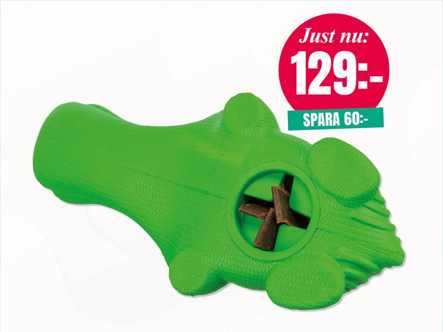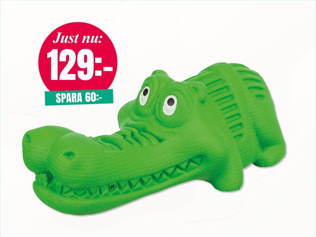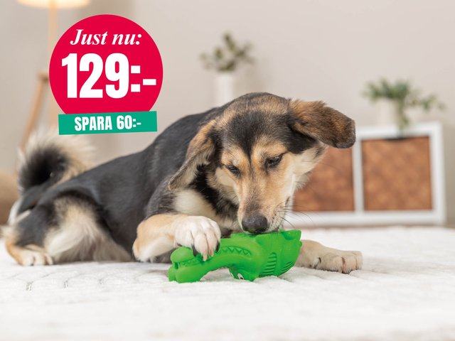 Gör snackstunden rolig och aktiverande för din hund med en tĂ„liga krokodil i naturgummi. Den kan fyllas med godis eller torrfoder och Ă€r helt ljudlös â perfekt för berikande inomhusaktivering. Storlek: 18 cm.