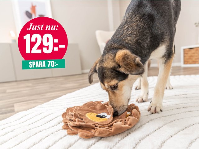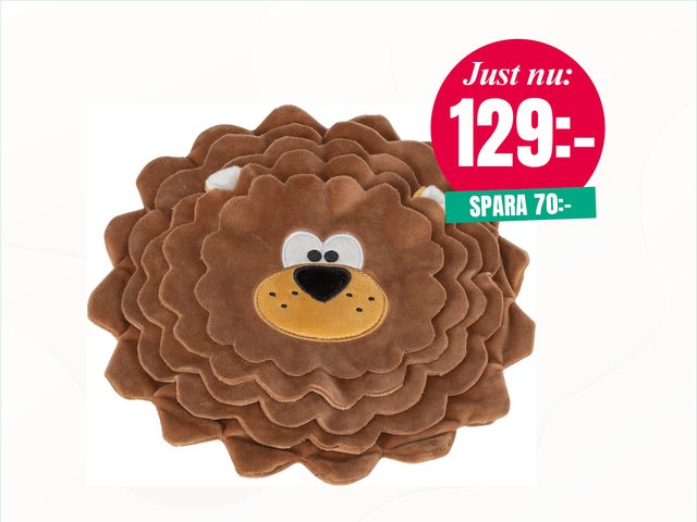 Ett mjukt och prassligt snackslejon som bjuder din hund pÄ bÄde aktivering och belöning. Fyll mattan med godis eller foder och lÄt hunden leta. Tillverkad av Ätervunnet material. Storlek: à 26 cm.