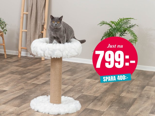 Mysig klösmöbel med fluffig plyschbädd likt ett mjukt moln på top-pen. Pelare i klösvänligt jutematerial som katten kan klösa på och sträcka sig mot.