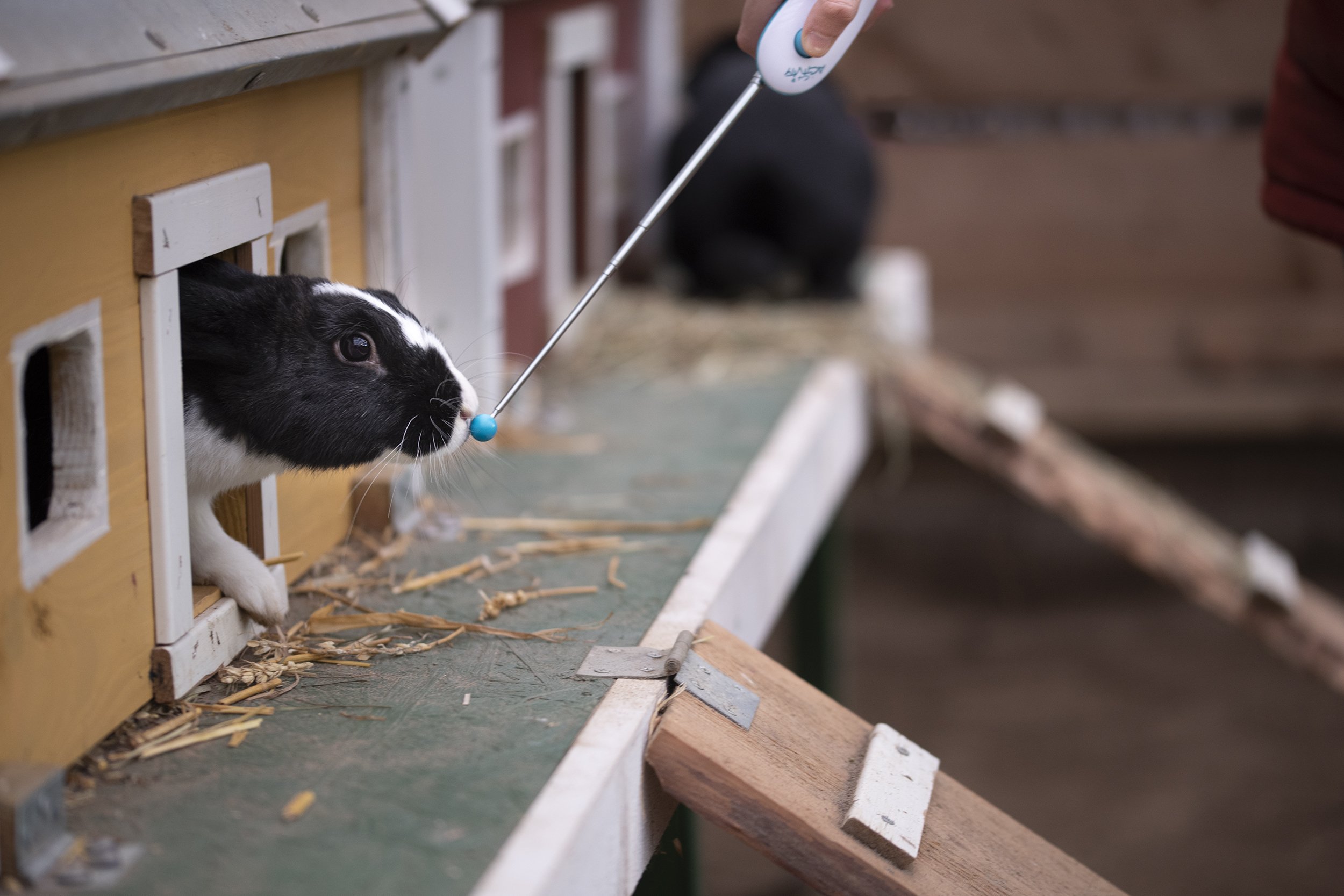 Genom att lära din kanin att följa en targetpinne med sin nos kan du lära den att till exempel komma på inkallning. Saker som ett djur ska beröra med sin kropp kallas ofta för target, och i det här fallet ska kaninen röra en liten boll på spetsen av en pinne – en targetpinne – med sin nos.